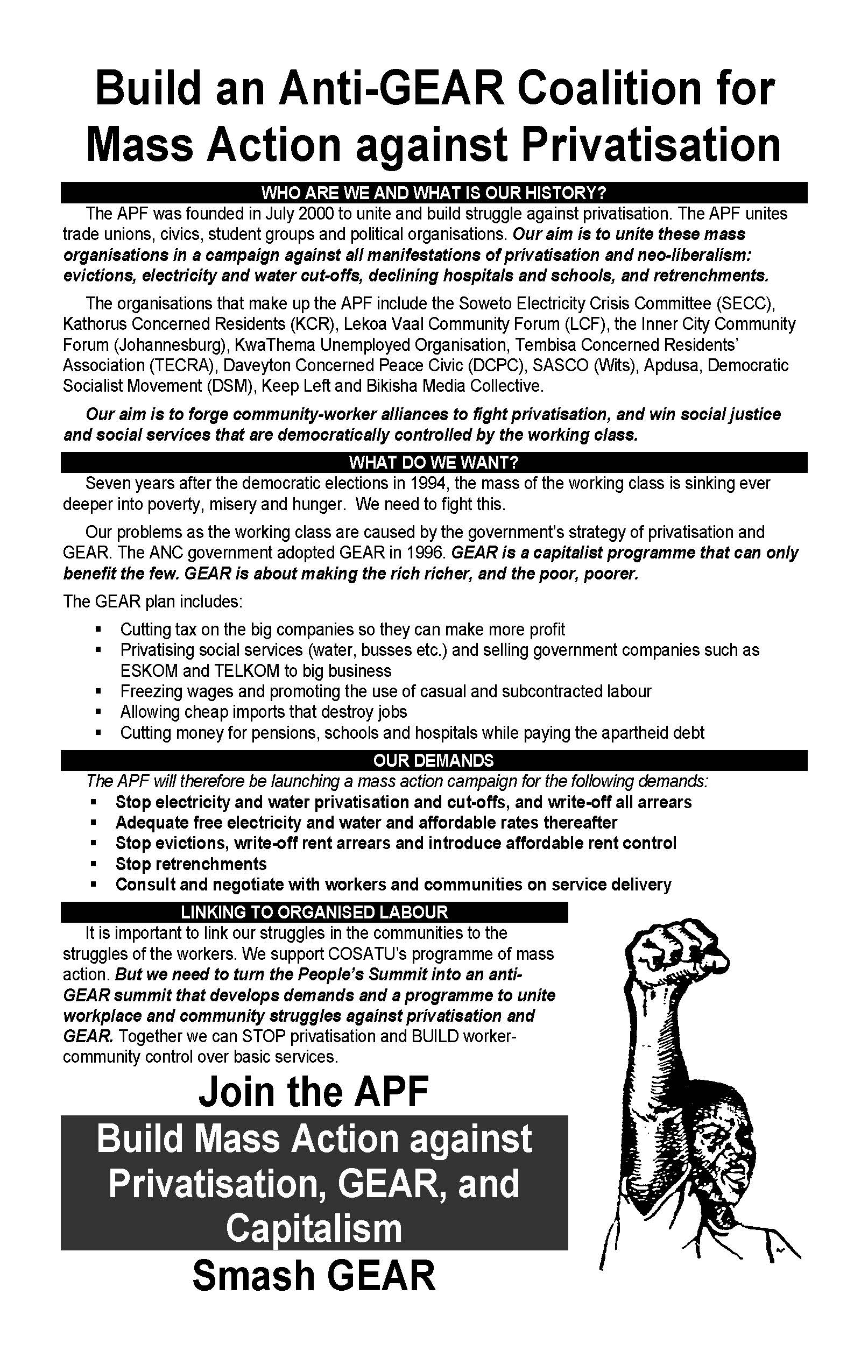 [STATEMENT]: October 2001 – APF: “Build an Anti-GEAR Coalition for Mass Action against Privatisation”