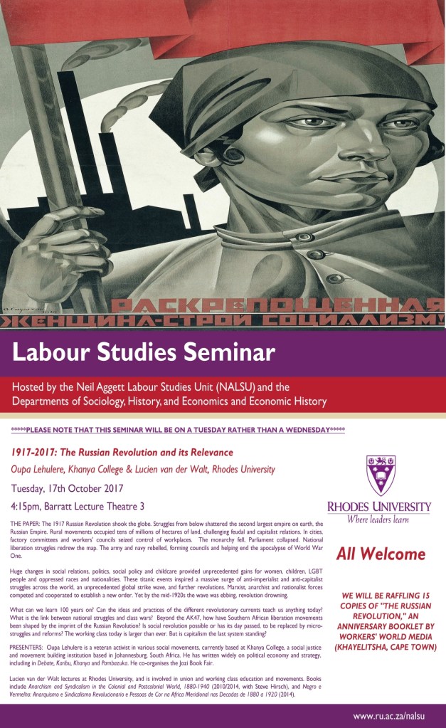 The next seminar in the Labour Studies Seminar Series is presented by Oupa Lehulere and Lucien van der Walt, entitled “1917-2017: The Russian Revolution and its Relevance Today”. This will be the last seminar for 2017.