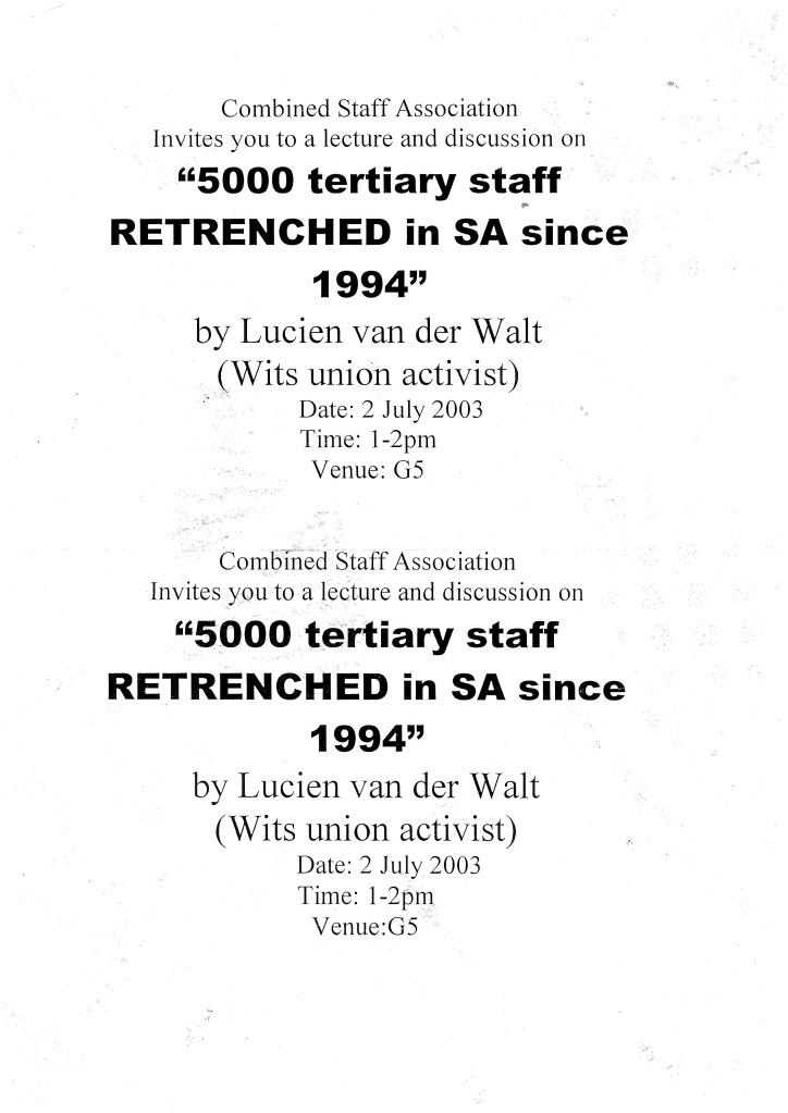 [TALK]: Lucien van der Walt, 2003, “University Restructuring: Whose Gain, Whose Pain, Whose Transformation?,” poster for talk to UDW’s Combined Staff Assoc.